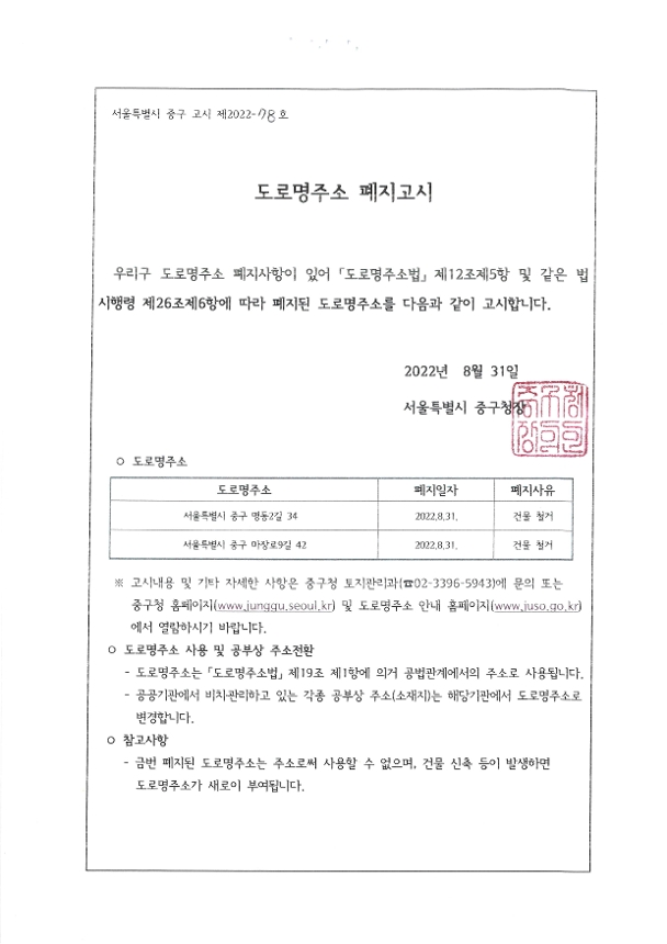 | 분류 | 일반공공행정 > 일반행정 > 주소정책 > 도로명주소 부여 및 폐지 고시 | ||