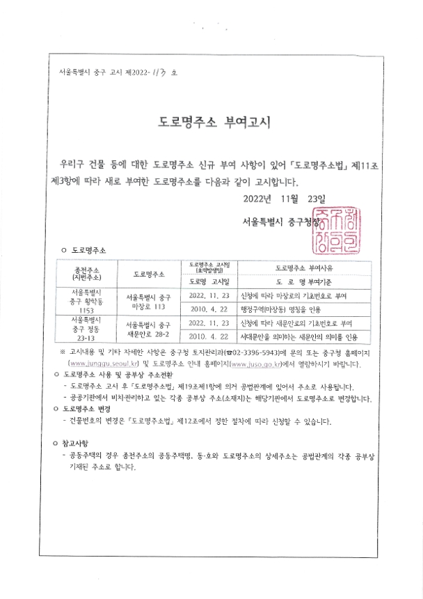 | 분류 | 일반공공행정 > 일반행정 > 주소정책 > 도로명주소 부여 및 폐지 고시 | ||