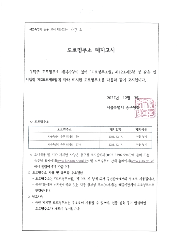 | 분류 | 일반공공행정 > 일반행정 > 주소정책 > 도로명주소 부여 및 폐지 고시 | ||