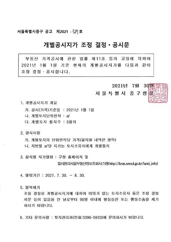 | 이전글 | 2021.7.1.기준 개별공시지가 결정 공시 |